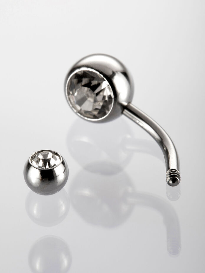Banánek piercing do pupíku s kuličkamí s čirými krystaly z chirurgické oceli je skvělým doplňkem k jakémukoliv outfitu.