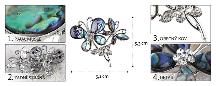 Zajímavá brož má tvar dvou motýlů, jejichž křídla jsou dekorována Paua perletí, která upoutá pozornost svými duhovými barvami. Celý šperk je navíc ozvláštněn několika drobnými broušenými krystalky různých velikostí. K jeho přichycení na oděv slouží zavírací špendlík na zadní straně. Tato brož je určena pro všechny věkové kategorie a  hodí se pro běžné nošení i zvláštní příležitosti