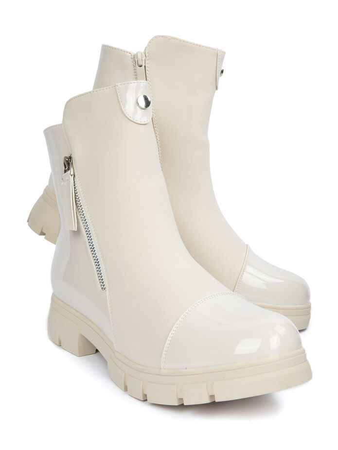 Tyto stylové kotníčkové boty nesmí ve vašem šatníku chybět! Boty jsou kotníčkové a mají zapínání na zip, uvnitř jsou boty vytepleny hřejivým kožíškem. Boty jsou z umělé eko kůže a mají leštěnou špičku a zadní část obuvi. Z boku obuvi je ozdobný zip. Podrážka obuvi je ohebná a tak se v této obuvi budete vždy cítit pohodlně. Na výběr jsou boty v černé a béžové variantě. Udělejte si i vy radost touto stylovou obuví!