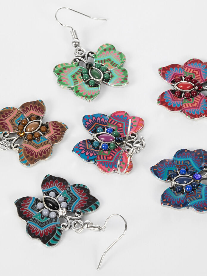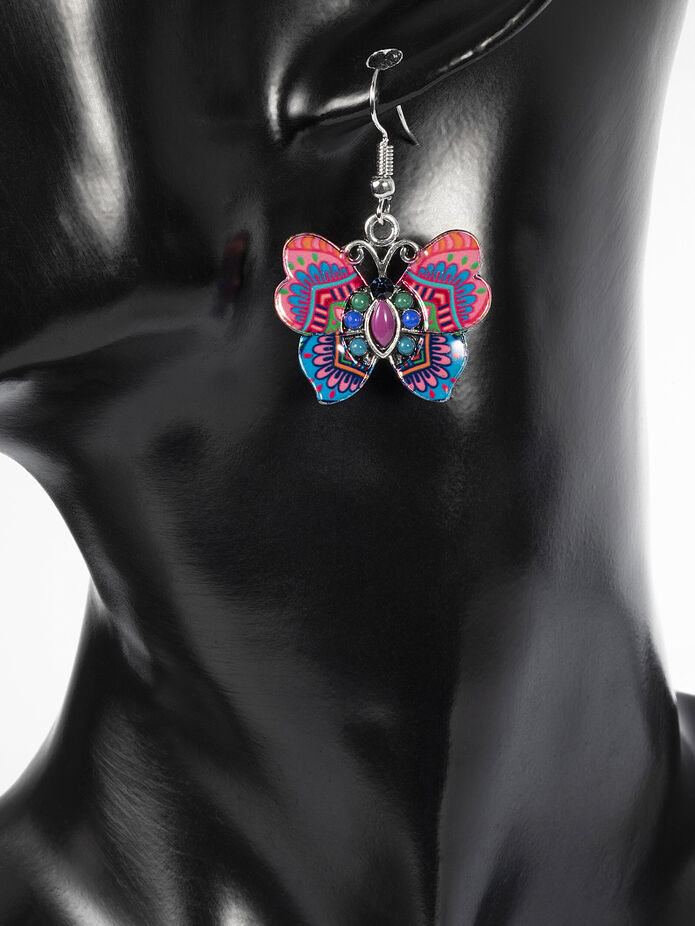 Stylové náušnice ve tvaru motýlka. Náušnice jsou krásně barevné, visací a z obecného kovu.Udělejte si i vy radost tímto kouzelným doplňkem, který oživí každý outfit!