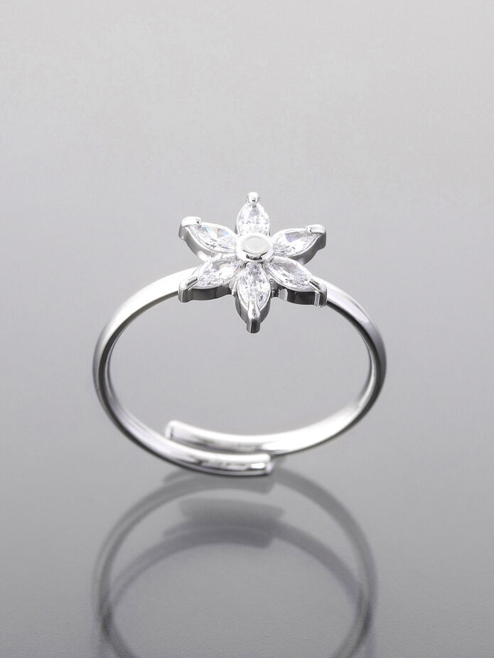 Moderní, decentně zdobený prsten kytičkou s krystalky. Překrásný šperk pro každodenní eleganci – nadčasový a vhodný pro každou příležitost.