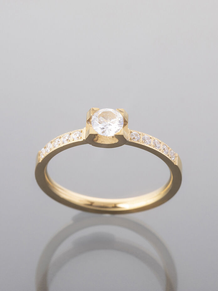 Moderní, decentně zdobený prsten s krystalky. Na výběr ve zlaté, nebo stříbrné barvě kovu. Překrásný šperk pro každodenní eleganci – nadčasový a vhodný pro každou příležitost.