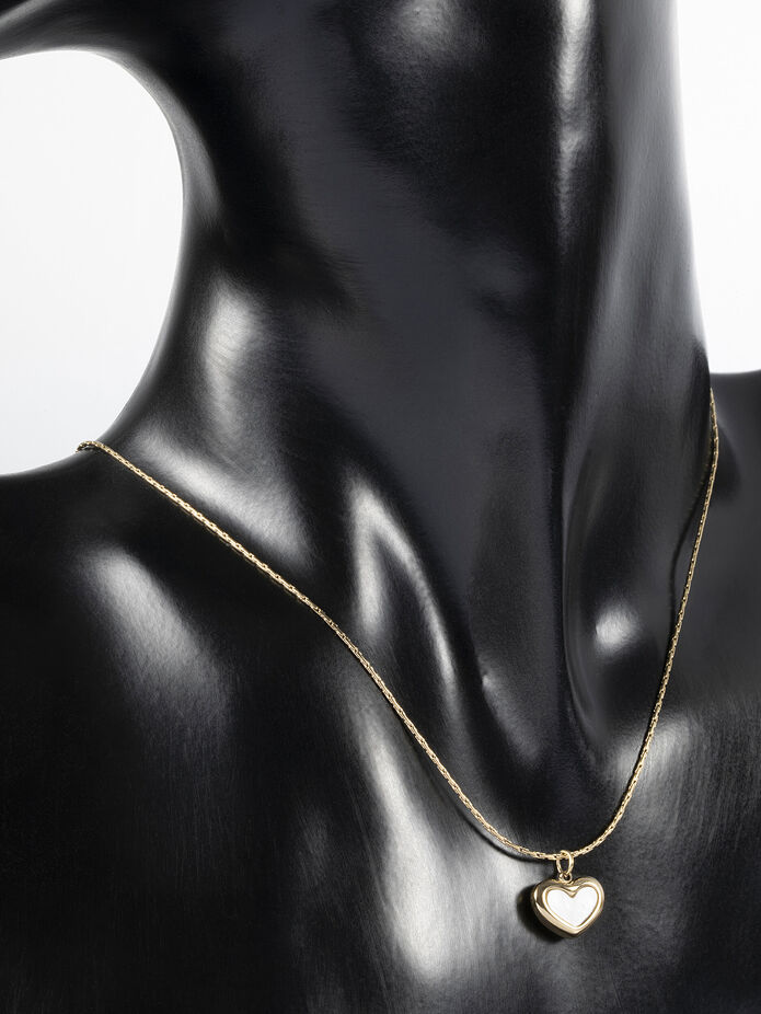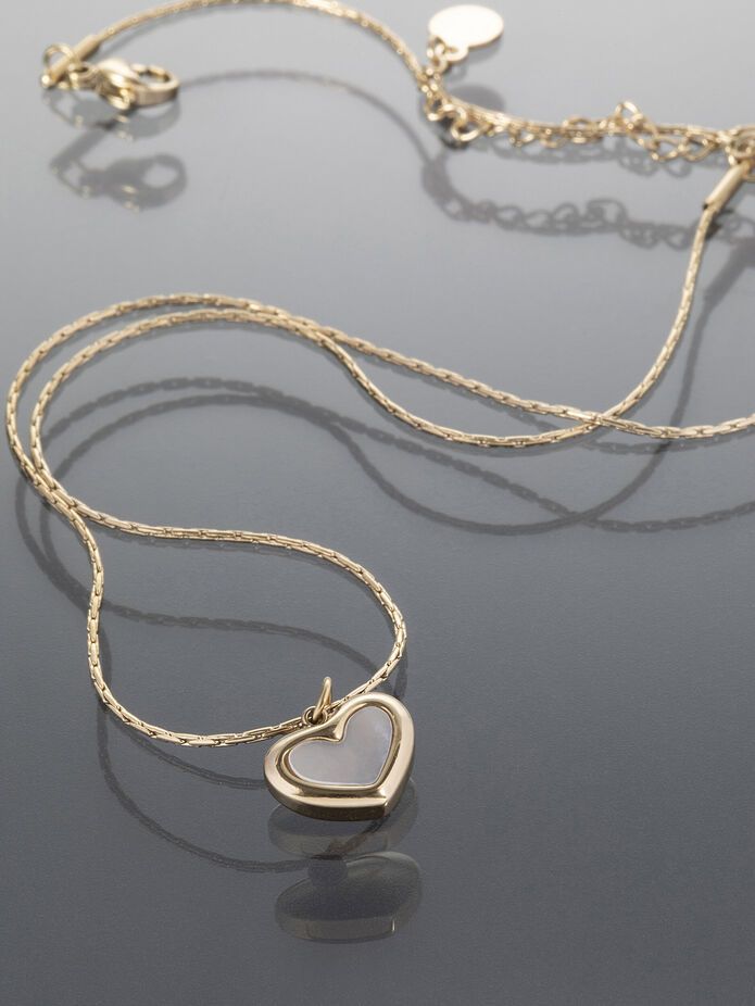 Decentní náhrdelník z leštěné chirurgické oceli s třpytivým přívěskem ve tvaru srdíčka s perletí uvnitř. Je skvělým doplňkem k jakémukoliv outfitu. Udělejte si i vy radost tímto překrásným doplňkem!