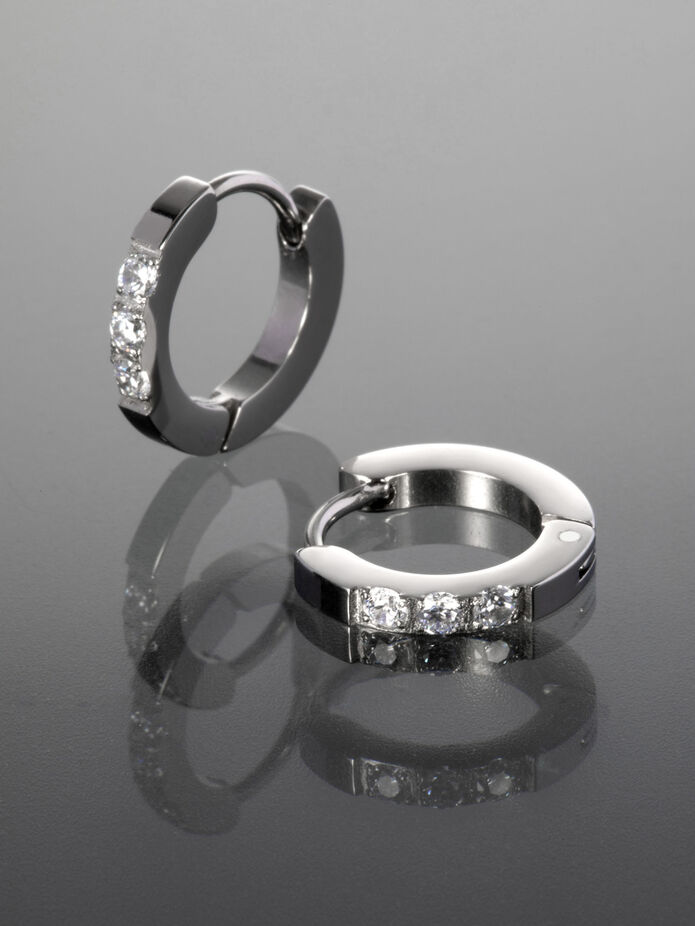 Luxusní drobné kruhové náušnice z chirurgické oceli s drobnými čirými krystaly dokonale doladí jakýkoliv outfit. Průměr náušnic je cca 1,3 cm, šířka náušnic je 2 mm. Zapínání je na ruský patent, tento typ zapínání skvěle drží a tak náušnice samovolně nevypadnou. Náušnice stříbrné barvy jsou malé kroužky, které jsou v přední části zdobeny třemi drobnými čirými krystaly, zpracování působí opravdu moderně, vkusně a nadčasově.