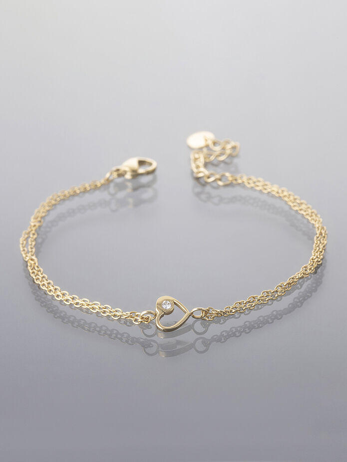 Dvojitý řetízkový náramek z chirurgické oceli zdobený drobným srdíčkem, zlatá barva kovu.