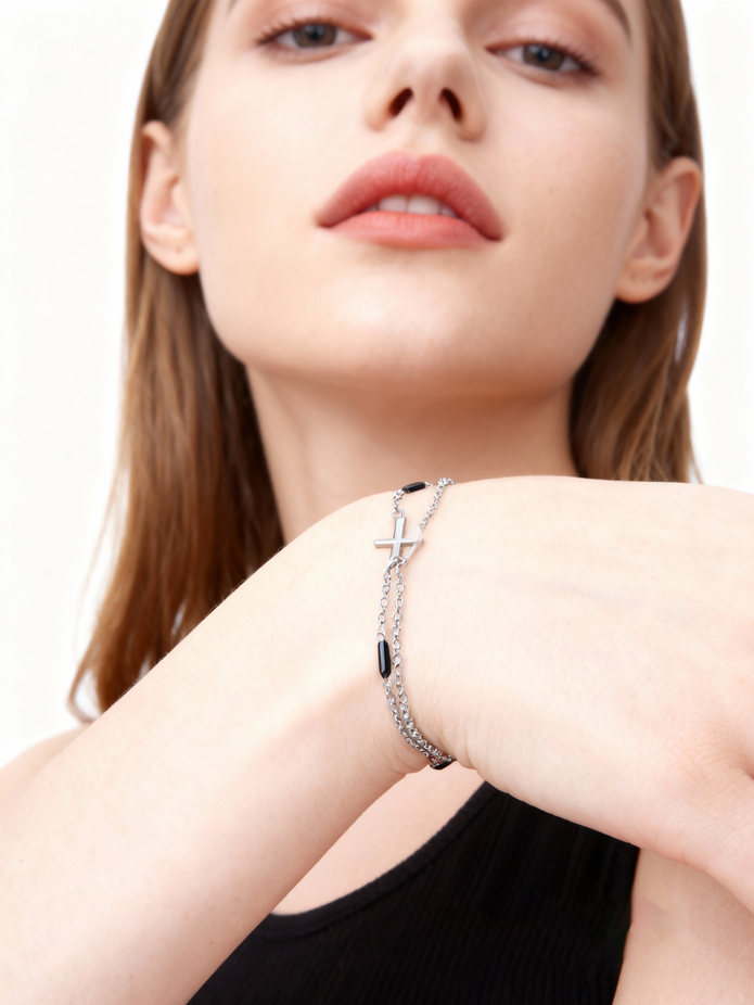 Dvojitý řetízkový náramek z chirurgické oceli s křížkem a jemnými černými ozdobami je moderním doplňkem vhodným ke každému outfitu i ke každé příležitosti. Délka náramku je nastavitelná od 17 do 20 cm. Zapínání na karabinku, která výborně drží a proto náramek samovolně nesklouzne ze zápěstí. Nabízíme ve stříbrné nebo zlaté barvě oceli.