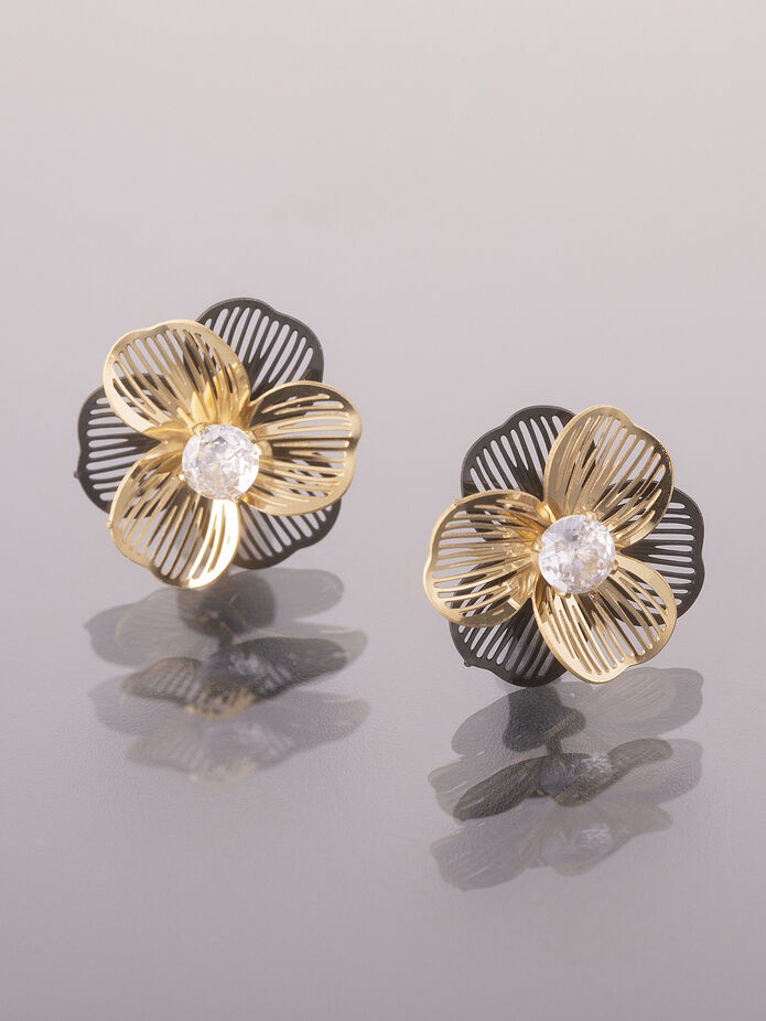 Překrásné romantické náušnice vyrobené z chirurgické oceli. Jsou zpracovány do tvaru květu, barva černá a zlatá. Ozdobeny jsou drobnými třpytivými krystalky. Zpracování působí opravdu moderně, jemně, vkusně a nadčasově. Náušnice jsou vhodné zejména na běžné nošení, ale i na výjimečné příležitosti.