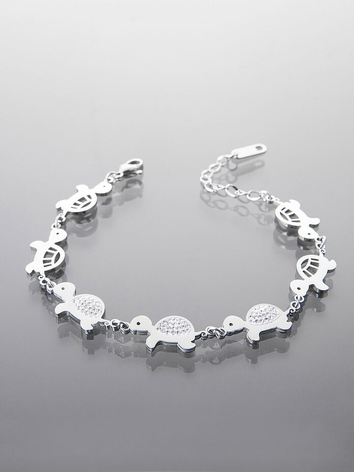 Tento elegantní náramek ve tvaru želviček je dokonalým doplňkem pro každou ženu či dívku, která hledá něco výjimečného. Vyrobený z chirurgické oceli, tento náramek nejenže vypadá skvěle, ale také zaručuje dlouhou životnost a odolnost proti poškození. Lesklá povrchová úprava dodává náramku na atraktivitě a zajišťuje, že se stane středem pozornosti na každé akci. Díky jemným zářivým krystalkům, které jsou umístěny na želvičkách, náramek přidává nádech elegance, což z něj činí ideální volbu pro každou příležitost. Zapínání na karabinu zajišťuje snadné a bezpečné nošení, takže se nemusíte obávat, že by náramek spadl nebo se ztratil.