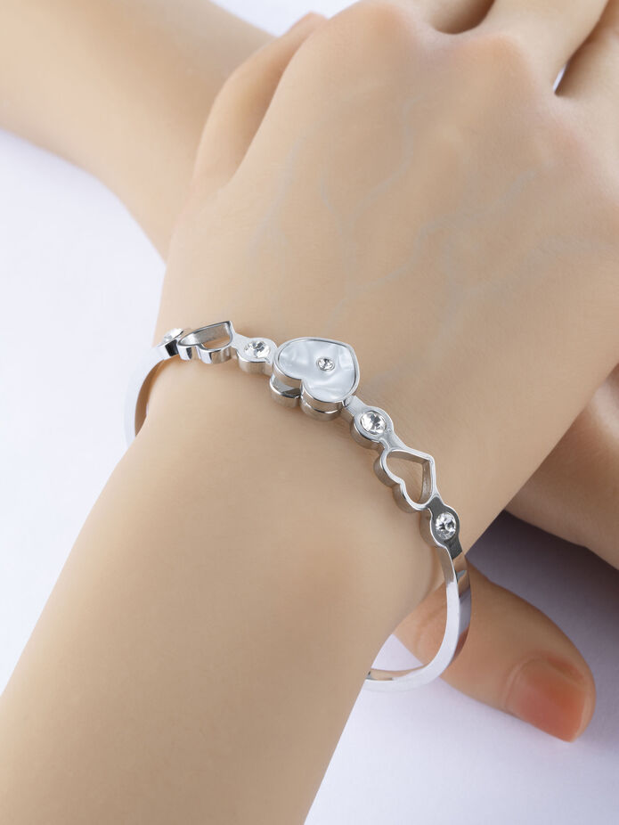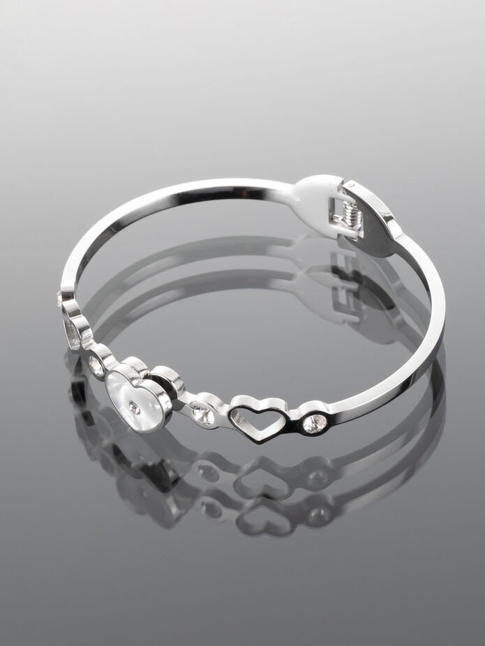 Elegantní náramek z chirurgické oceli zdobený štrasovými kamínky, jedním centrálním a dvěma menšími srdíčky po stranách. Zapínání na pružinu. Vhodné i pro alergiky.