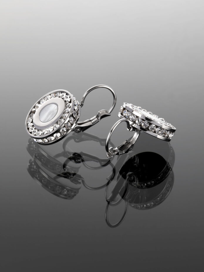 Krásné náušnice z leštěné chirurgické oceli vykládané vysoce třpytivými čirými krystaly.