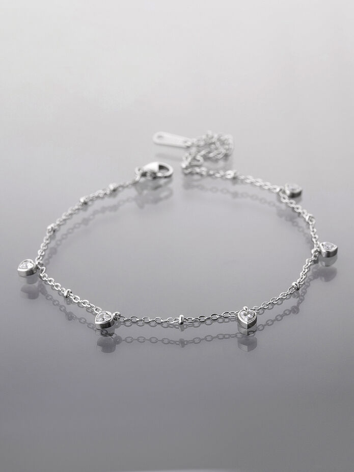 **ANALÝZA OBRÁZKU:** Na obrázku je vidět elegantní stříbrný řetízek na nohu, který je vyroben z chirurgické oceli. Řetízek je osazen krystalem ve tvaru srdce, což mu dodává romantický vzhled. Délka řetízku je nastavitelná, což zajišťuje pohodlné nošení pro různé velikosti nohou.