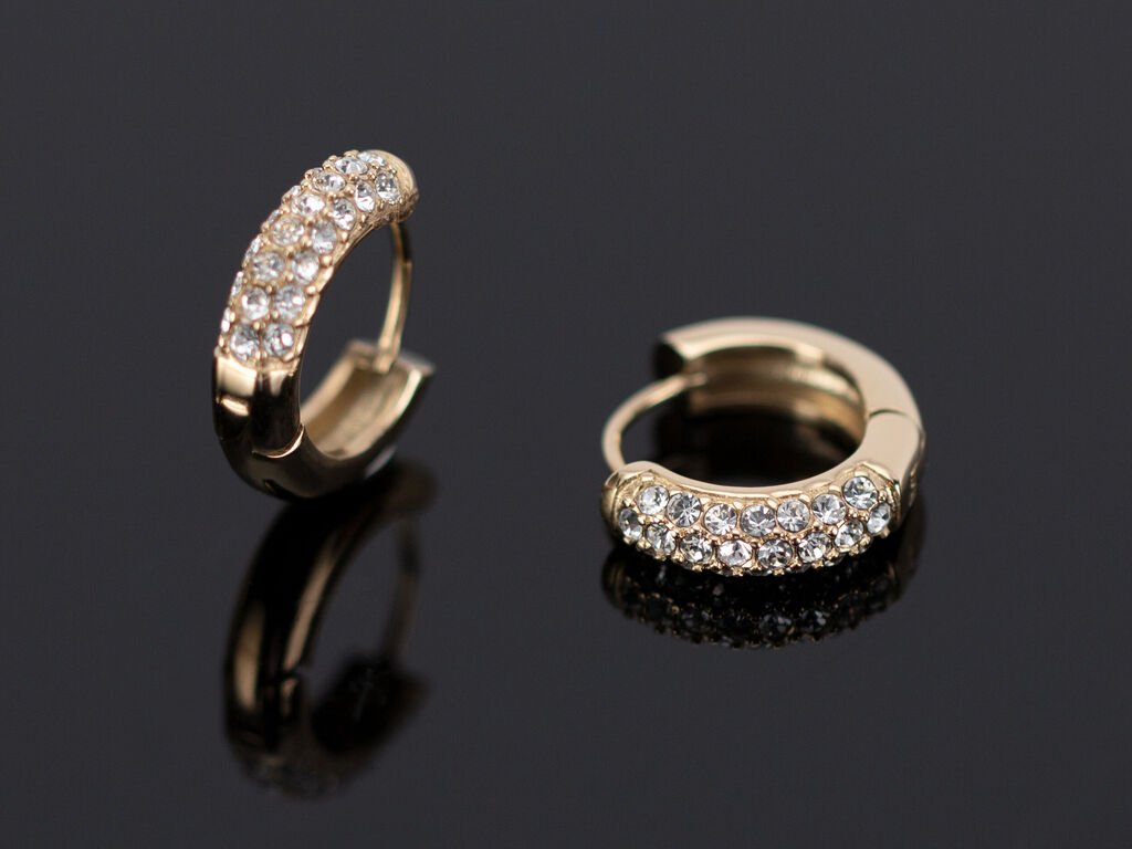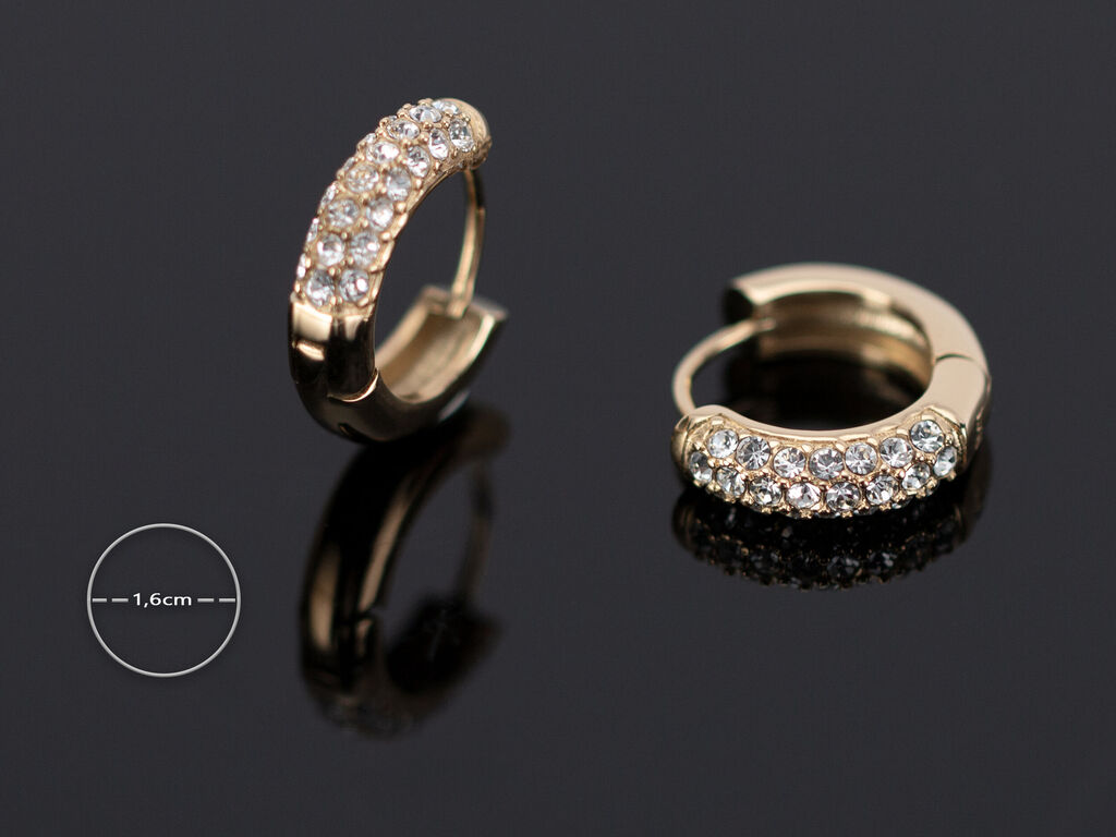 Exkluzivní kruhové náušnice z chirurgické oceli zlaté barvy vykládané vysoce třpytivými krystaly. Náušnice jsou kvalitně zpracované, nemění barvu a jsou vhodné pro alergiky.