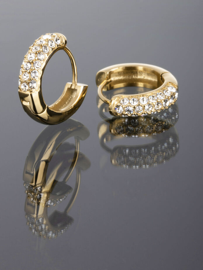 Exkluzivní kruhové náušnice z chirurgické oceli zlaté barvy vykládané vysoce třpytivými krystaly.