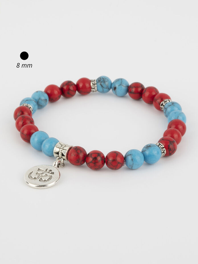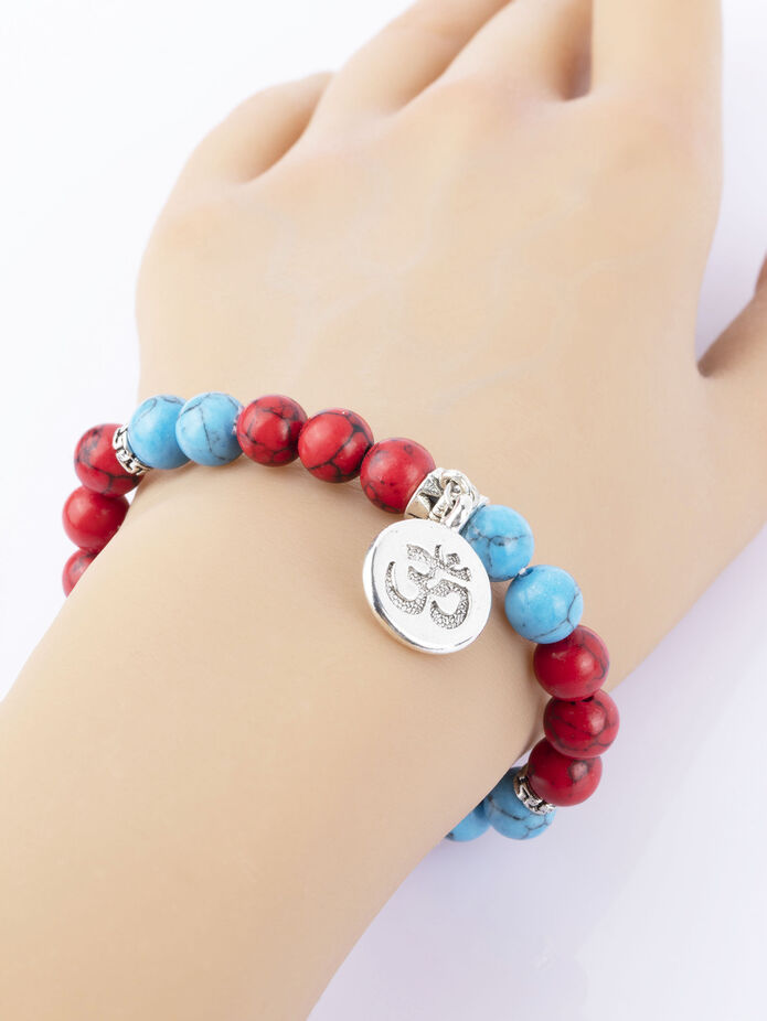 Exkluzivní náramek z korálků modrého a červeného barveného kamene s přívěskem ohm je skvělým doplňkem ke každému outfitu, perfektně doladí a podtrhne nevšední vzhled každé dámy či muže.