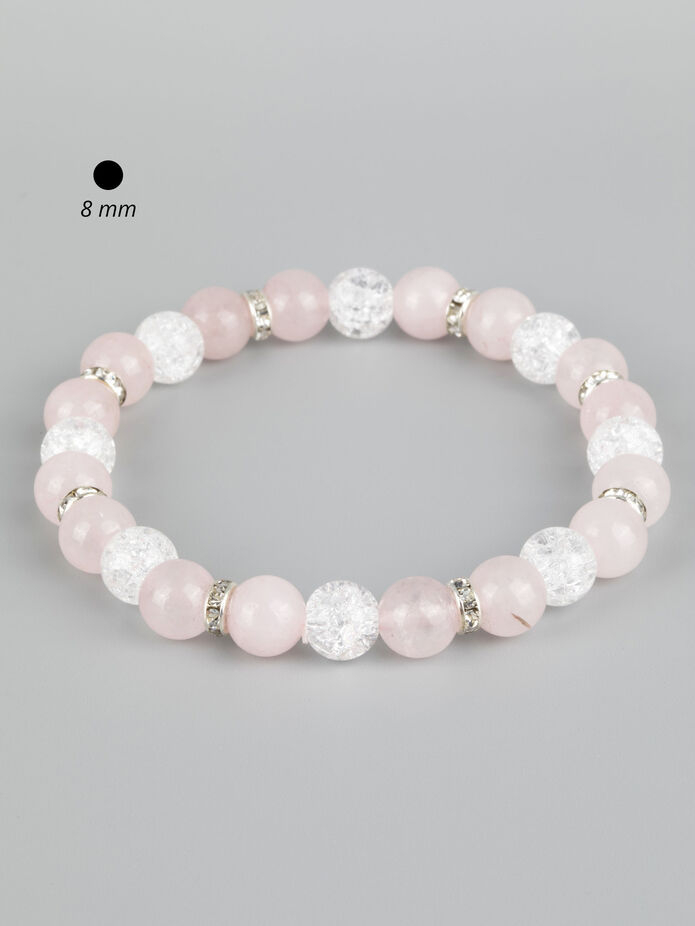 Obvod náramku je cca 19 cm, průměr korálků je 0,8 cm. Korálky minerálu jsou navléknuty na pružné gumičce, tento typ náramku skvěle drží a samovolně nespadne. Náramek je zhotoven z čirých korálků pukaného křišťálu a růžových korálků růženínu, je zdoben korálky z bižuterního kovu s čirými krystaly.