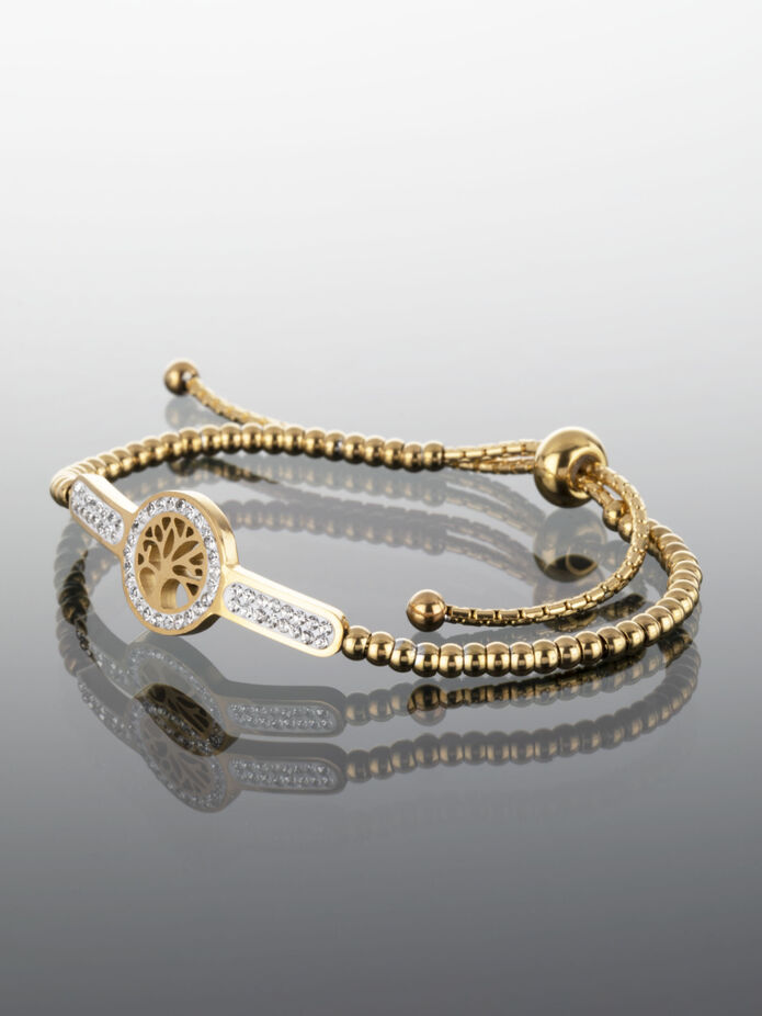 Exkluzivní náramek z chirurgické oceli ve zlaté barvě s korálky a destičkou s motivem stromu života vykládaný čirými krystaly je skvělým doplňkem k jakémukoliv outfitu. Obvod náramku je nastavitelný cca do 24 cm, šířka náramku je 0,2 cm. Zapínání je posuvné, tento typ zapínání skvěle drží a tak náramek samovolně nespadne. Náramek je zhotoven jako pevný drobný řetízek zlaté barvy, je zdoben korálky a destičkou s motivem stromu života, destička je vykládána čirými krystaly. Náramek působí velmi elegantně, moderně a nadčasově.