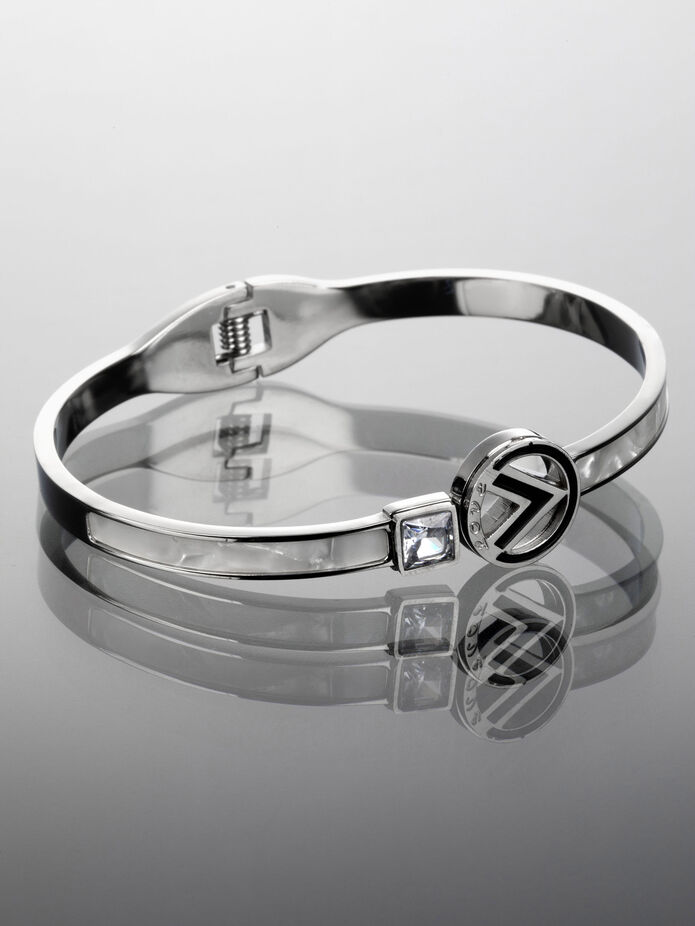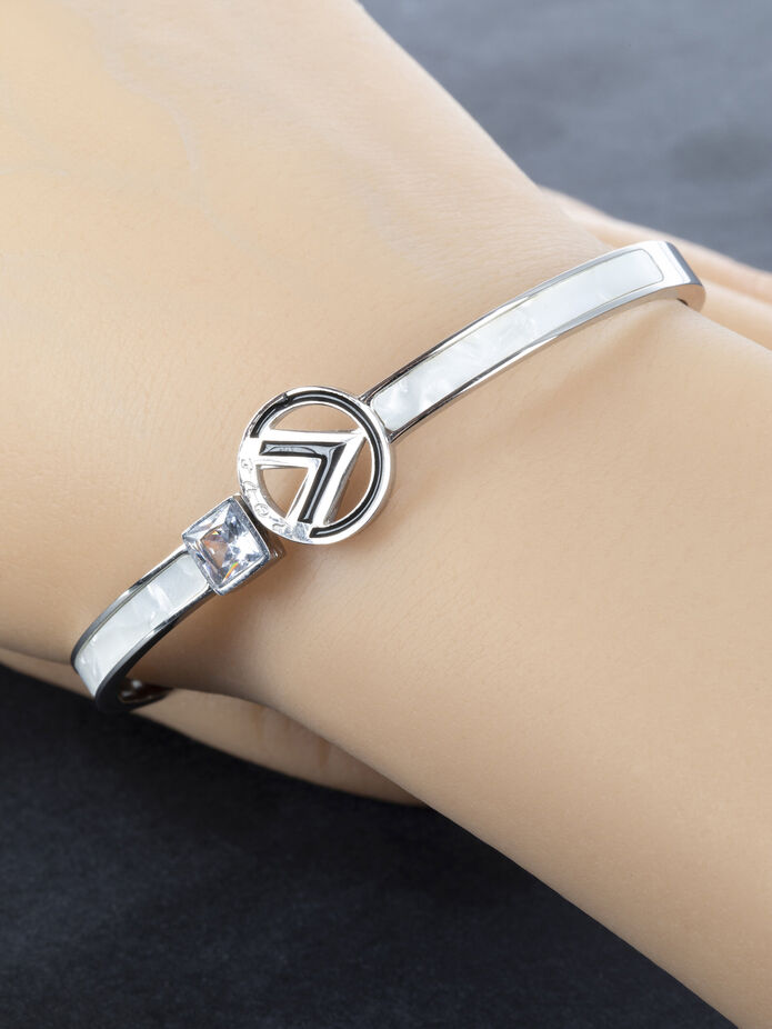 Exkluzivní pevný náramek z chirurgické oceli s kroužkem a čtverečkem s čirým krystalem a bílou perletí je skvělým doplňkem k jakémukoliv outfitu.