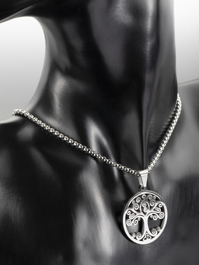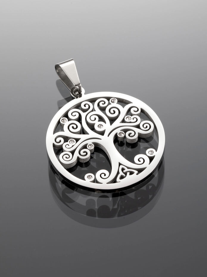 Exkluzivní přívěsek s motivem stromu života s drobnými čirými krystaly z chirurgické oceli je skvělým doplňkem k jakémukoliv outfitu.