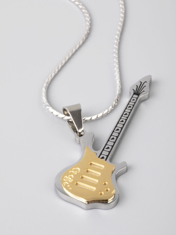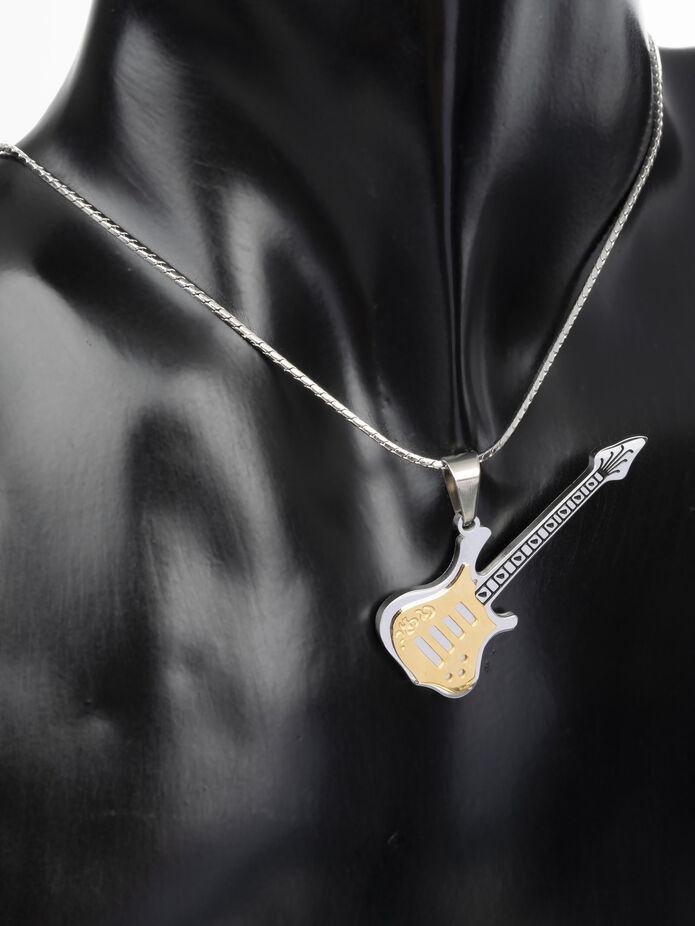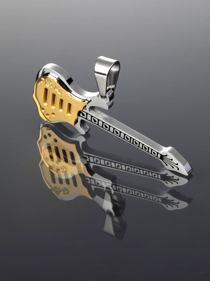 Exkluzivní přívěsek ve tvaru elektrické kytary z chirurgické oceli zlaté a stříbrné barvy je skvělým doplňkem k jakémukoliv outfitu.