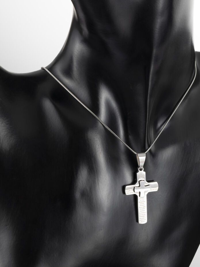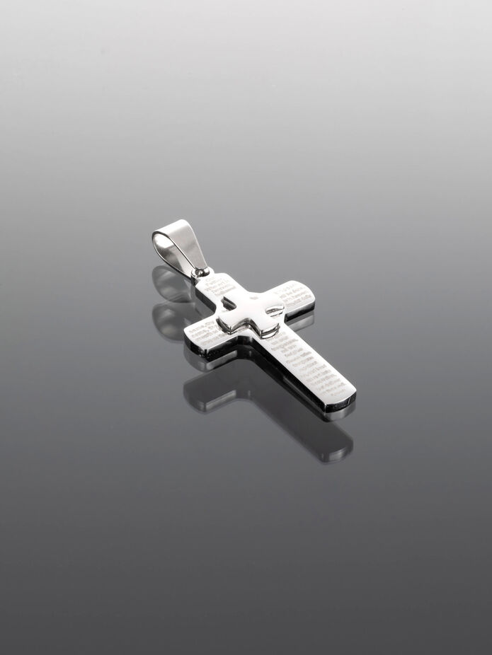 Exkluzivní přívěsek ve tvaru kříže s drobným křížkem a modlitbou z chirurgické oceli je skvělým doplňkem k jakémukoliv outfitu.