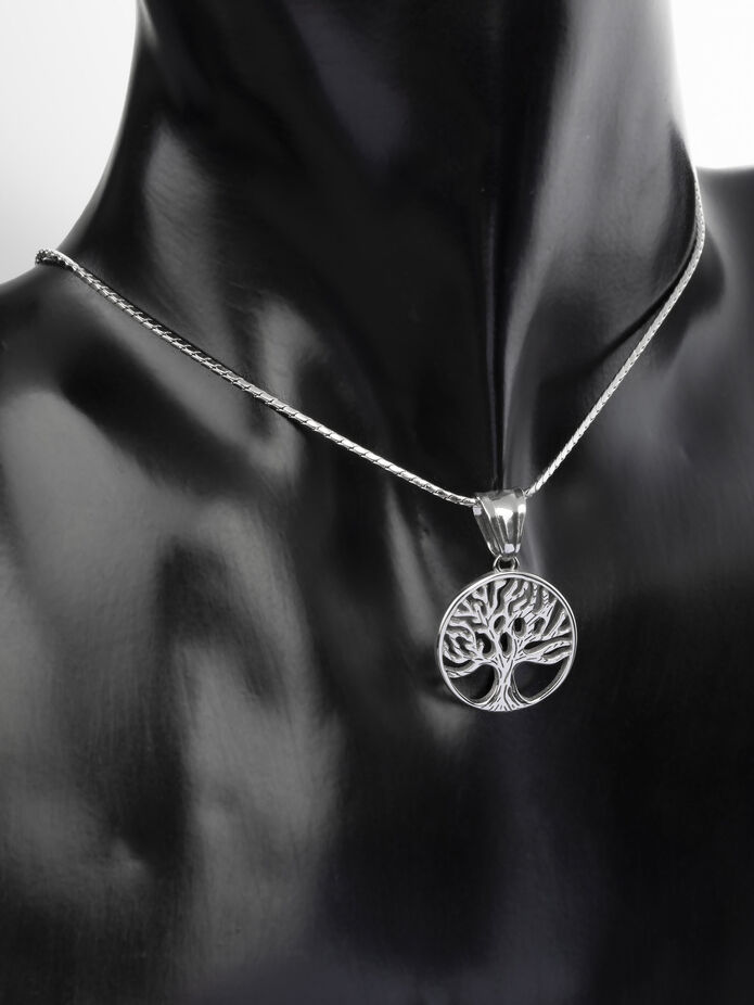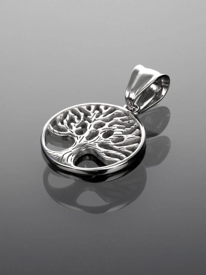 Exkluzivní přívěsek ve tvaru kruhu s motivem stromu života z chirurgické oceli je skvělým doplňkem k jakémukoliv outfitu.