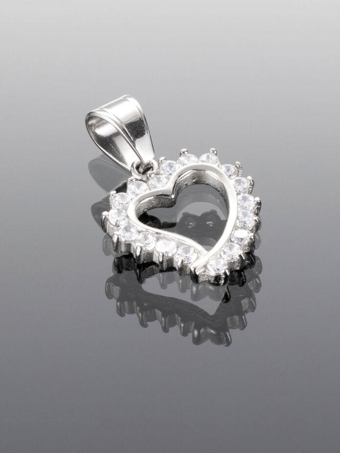 Exkluzivní přívěsek ve tvaru moderního srdce s čirými zirkony z chirurgické oceli je skvělým doplňkem k jakémukoliv outfitu.
