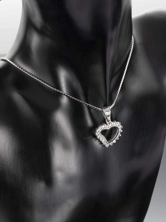 Přívěsek stříbrné barvy ve tvaru moderního srdíčka o rozměrech 2 x 2,1 cm je po obvodu vykládán čirými zirkony o průměru 2,5 mm. Jednoduché provedení působí velmi moderně, elegantně a nadčasově. Perfektně doladí outfit každé ženy s oblibou výrazných šperků.