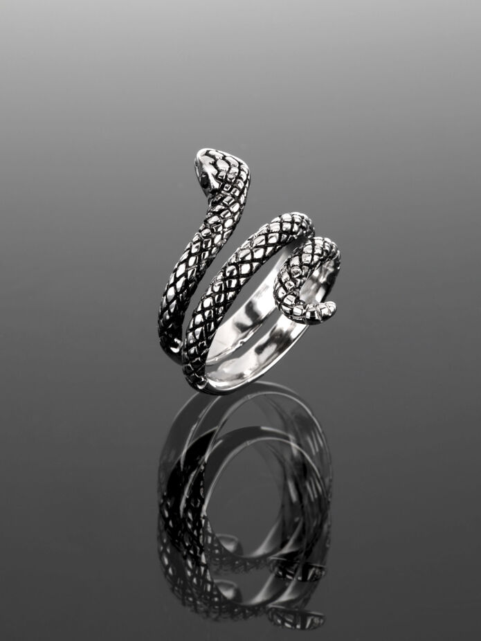 Exkluzivní unisex prstýnek z chirurgické oceli motivu hada je skvělým doplňkem k jakémukoliv outfitu. Šířka prstýnku je od 0,8 do 2,8 cm, k dostání jsou různé velikosti. Prsten je ve tvaru hada, který je obmotán kolem prstu, oči jsou vykládány drobnými černými krystaly, prsten tedy působí velmi nadčasově a moderně.