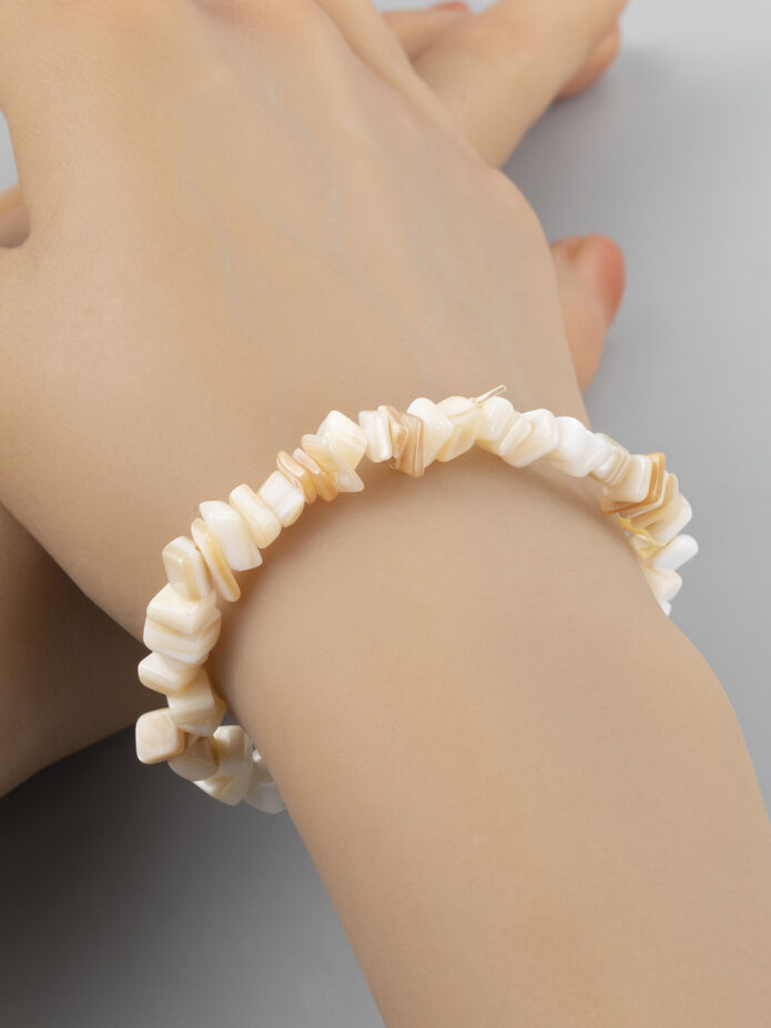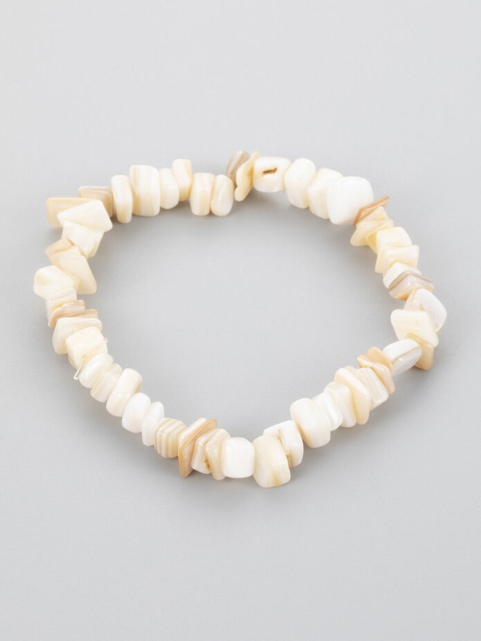 Exluzivní náramek ze sekaných kousků perleti je skvělým doplňkem k jakémukoliv outfitu. Kousky perleti jsou navlečeny na elastanové niti, díky které je náramek velice pružný, dobře drží na ruce a tak samovolně nesklouzne. Obvod náramku je 18 cm. Je vhodný na všední nošení, ale také jako doplněk k šatům či ke kostýmku na společenské události. Díky krémovému zbarvení působí velice výrazně a zároveň elegantně a dodá ženě eleganci a šarm. Náramek je vhodným doplňkem pro ženy s citem pro eleganci a oblibou výraznějších šperků. Jeho léčivé účinky ocení každá žena se zájmem o ezoteriku a alternativní léčbu.