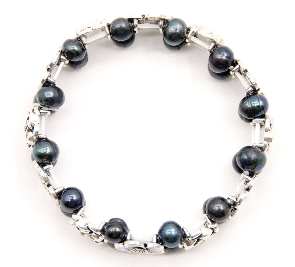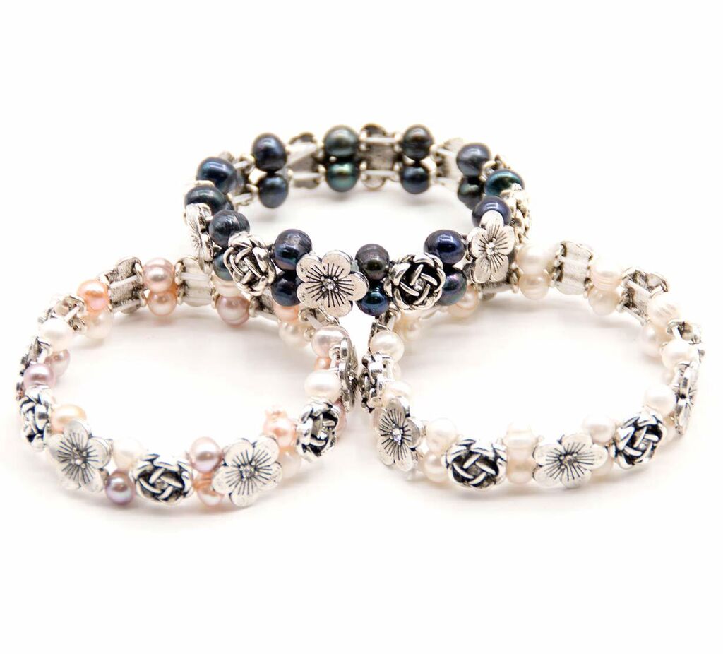 Elegantní náramek spojující překrásné říční perly a kov stříbrné barvy Vás ozdobí nejen pro všední den. Šperk je seskládán z říčních perel různých tvarů a barev, které se střídají s ozdobami opatřenými patinou. Ta dodává náramku zajímavý vintage vzhled. Náramek se obléká natažením přes ruku, díky gumičce je velice pružný.