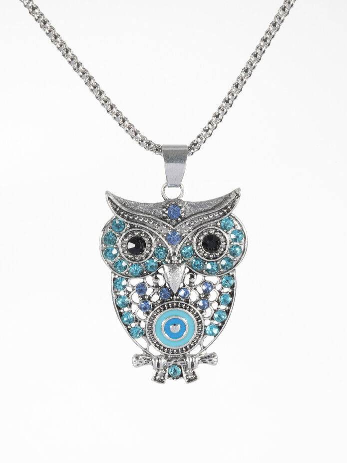 Výrazný náhrdelník, který oživí každý outfit. Tento náhrdelník má dlouhý řetízek širšího typu a je vyroben z obecného kovu. Zapnání řetízku je na karabinku. Přívěsek je tvaru sovičky, která je osazena krystalky různých barev. Na výběr je mnoho stylových barevných variant. Udělejte si i vy radost s tímto výrazným šperkem!