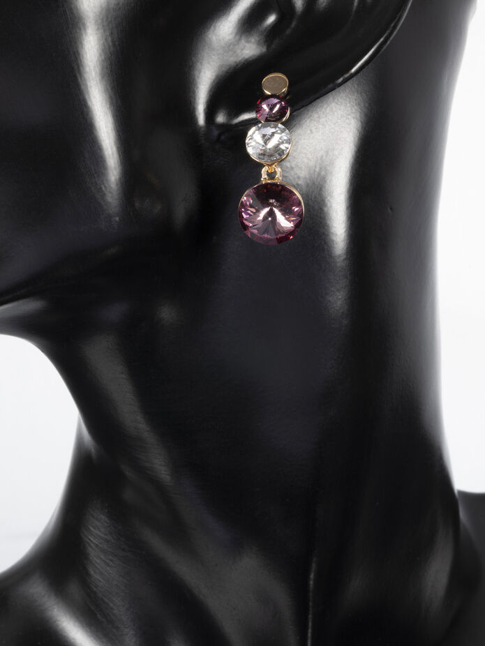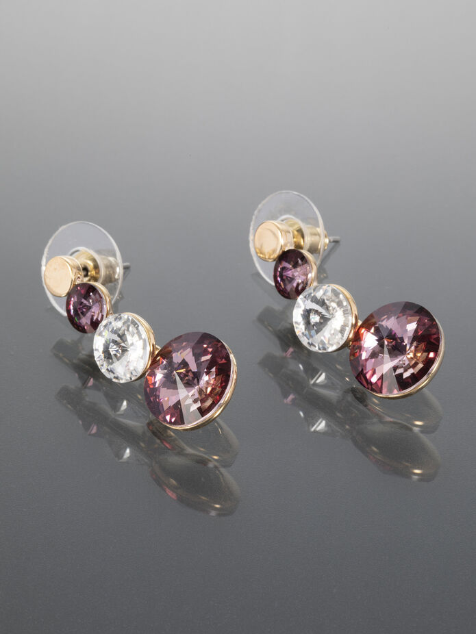 Stylové náušničky na puzetku. Tyto náušničky jsou z obecného kovu zlaté barvy a jsou zdobeny výraznými krystalky bílé a vínové barvy. Náušničky jsou jednoduché, ale stylové a svým leskem krásně rozzáří každý outfit. Udělejte si i vy radost tímto nadčasovým šperkem!