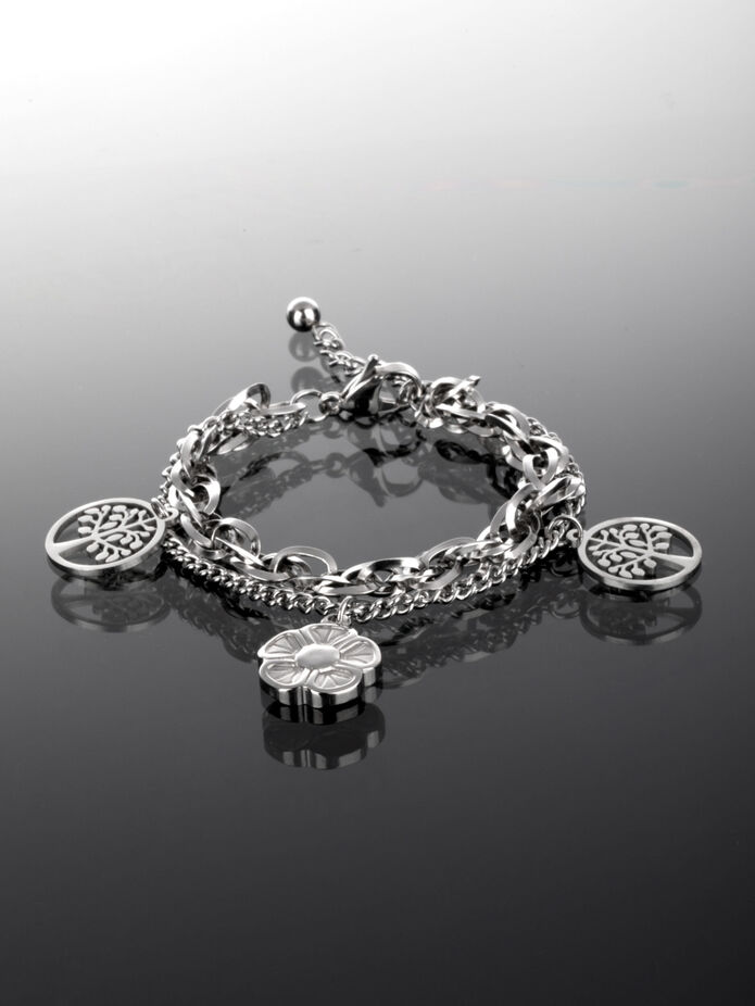 Hravý řetízkový náramek z chirurgické oceli s květinou, kuličkami a motivy stromu života je moderním doplňkem vhodným ke každému outfitu. Délka náramku je nastavitelná od 17,5 do 21 cm.