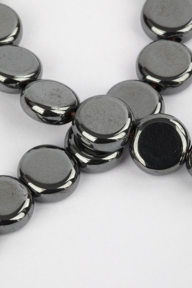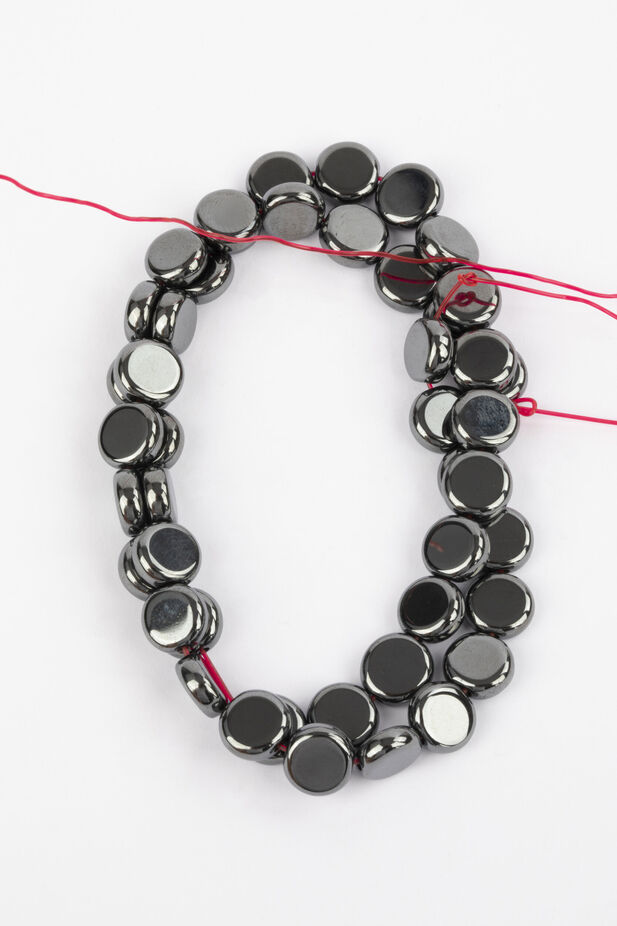Neukončená šňůra s korálky z vysoce lesklých černošedých placiček hematitu o průměru 8 mm. Na šňůře je navlečeno cca 45 korálků.
