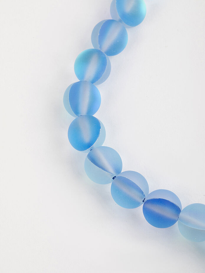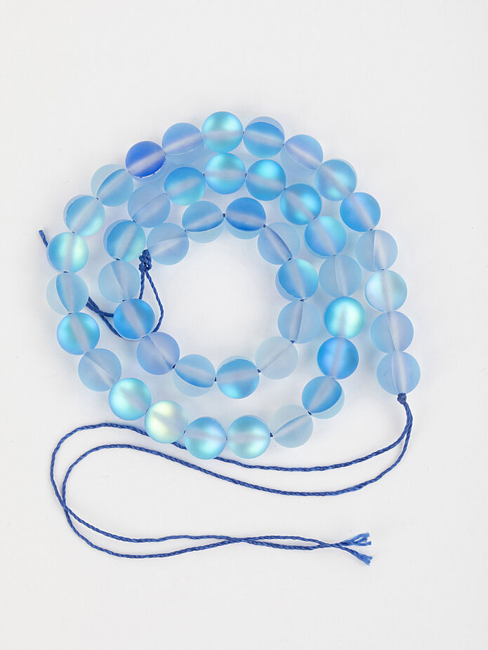 Neukončená šňůra s korálky ze syntetického měsíčního kamene, o průměru 8 mm. Na šňůře je navlečeno 44 - 50 korálků.