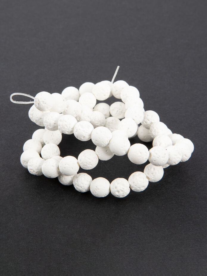 Neukončená šňůra s bílými lávovými korálky o průměru 6 mm. Na šňůře je navlečeno 62 - 64 korálků.