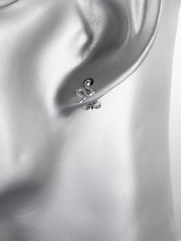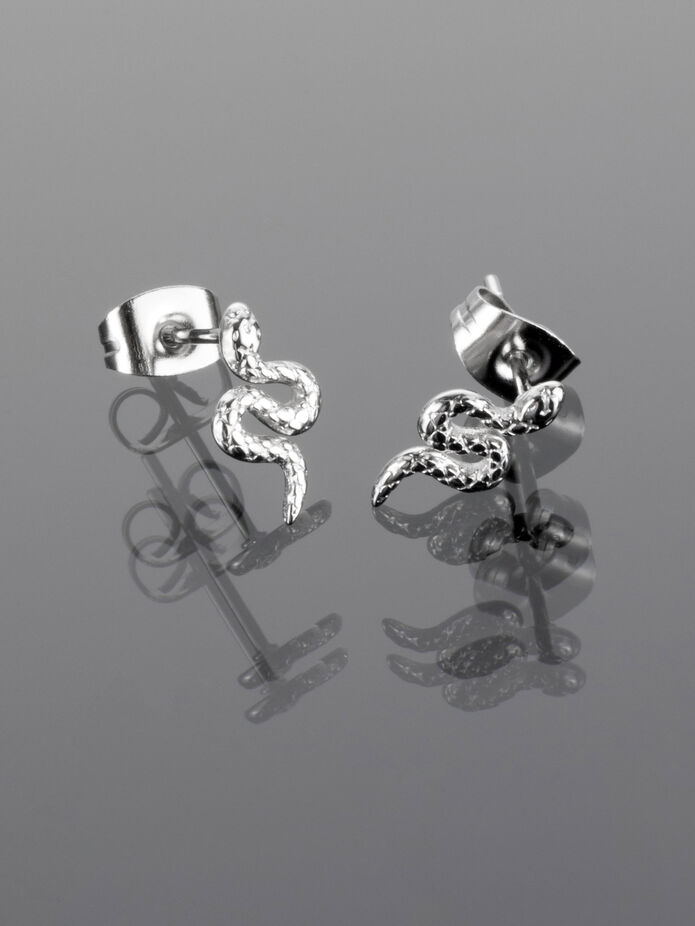 Krásné drobné náušnice ve tvaru hada z chirurgické oceli s rytými detaily jsou skvělým doplňkem k jakémukoliv outfitu. Rozměry náušnic jsou 6 x 12 mm. Zapínání je na puzetku, tento typ zapínání skvěle drží a tak náušnice samovolně nevypadnou. Náušnice stříbrné barvy z chirurgické oceli jsou zdobeny rytými detaily, zpracování působí opravdu vkusně a nadčasově.
