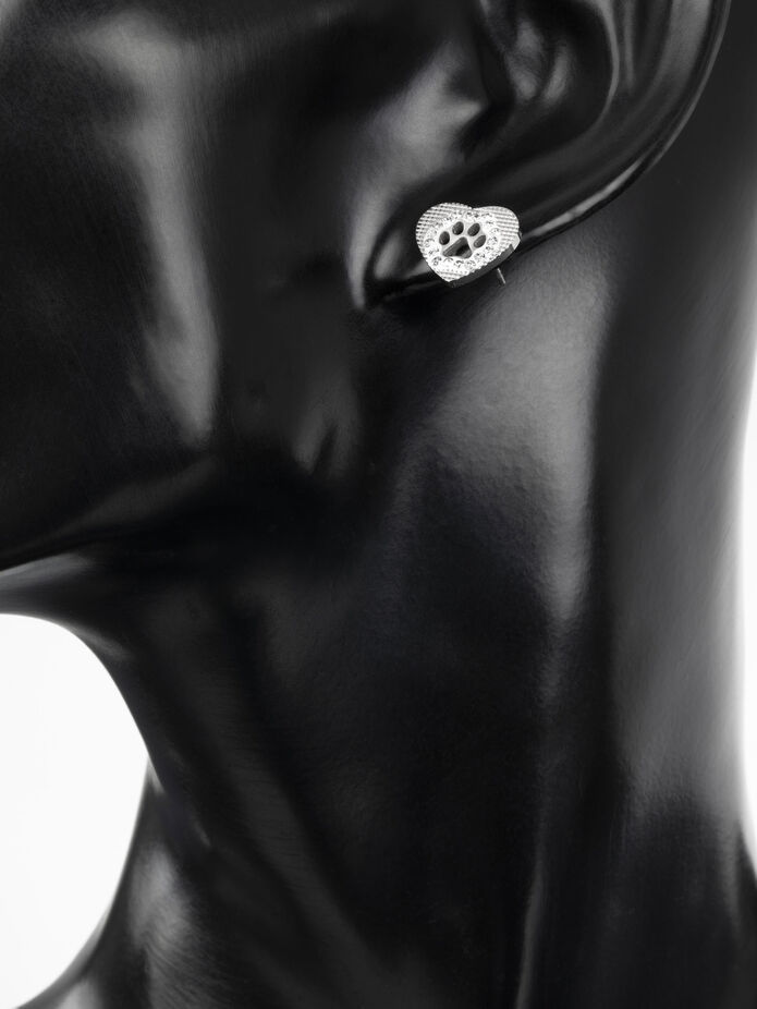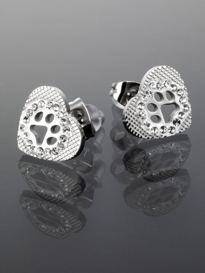 Krásné drobné náušnice ve tvaru srdíčka z chirurgické oceli s drobnými čirými krystaly jsou skvělým doplňkem k jakémukoliv outfitu. Rozměry náušnic jsou 1,3 x 1,1 cm. Zapínání je na puzetku, tento typ zapínání skvěle drží a tak náušnice samovolně nevypadnou. Náušnice stříbrné barvy ve tvaru srdíčka jsou zdobeny drobnými čirými krystaly a zvířecí tlapkou, zpracování působí opravdu vkusně a nadčasově.