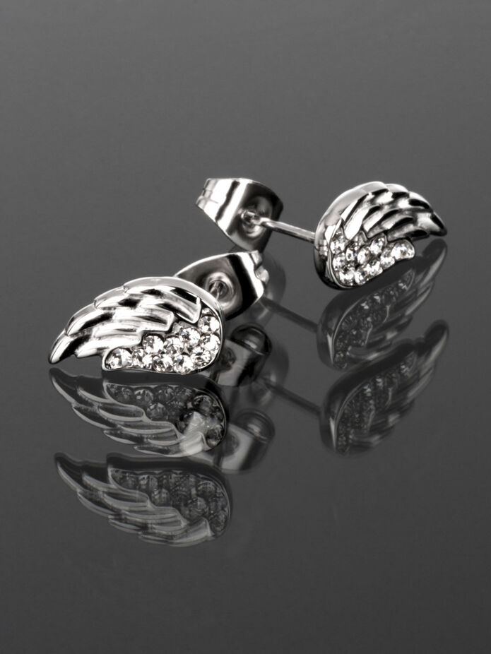 Krásné jemné náušnice andělská křídla z leštěné chirurgické oceli. Osazeny čirými krystaly.. Zapínání je na puzetu. Náušnice jsou kvalitně zpracované, nemění barvu a jsou vhodné i pro alergiky. Jsou balené v dárkové krabičce.