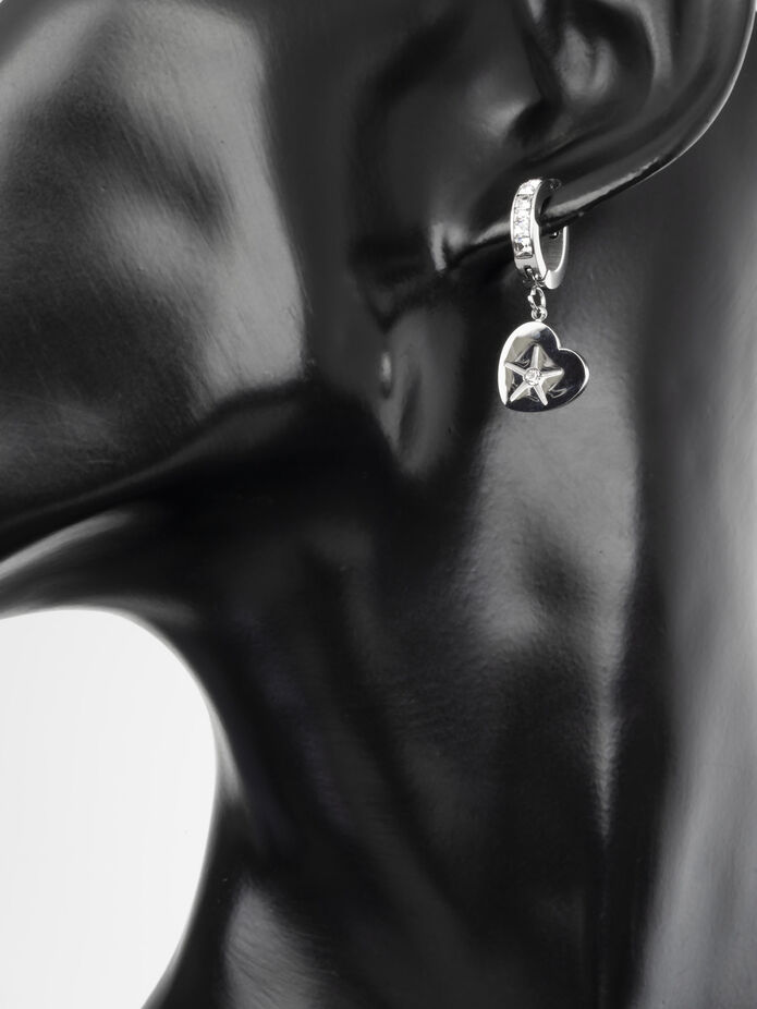 Krásné kruhové náušnice s přívěsky srdíček s drobným čirým krystalem z chirurgické oceli jsou skvělým doplňkem k jakémukoliv outfitu.