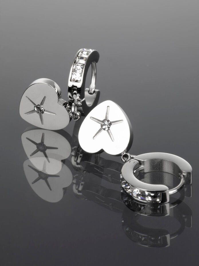 Krásné kruhové náušnice s přívěsky srdíček s drobným čirým krystalem z chirurgické oceli jsou skvělým doplňkem k jakémukoliv outfitu. Průměr náušnic je 1,3 cm, rozměry srdíčka jsou 1,1 x 1,2 cm, celková délka je 3 cm. Zapínání je na ruský patent, tento typ zapínání skvěle drží a tak náušnice samovolně nevypadnou. Náušnice stříbrné barvy z chirurgické oceli jsou zdobeny srdíčkem, které je vykládáno drobným čirým krystalem, zpracování působí opravdu vkusně a nadčasově.
