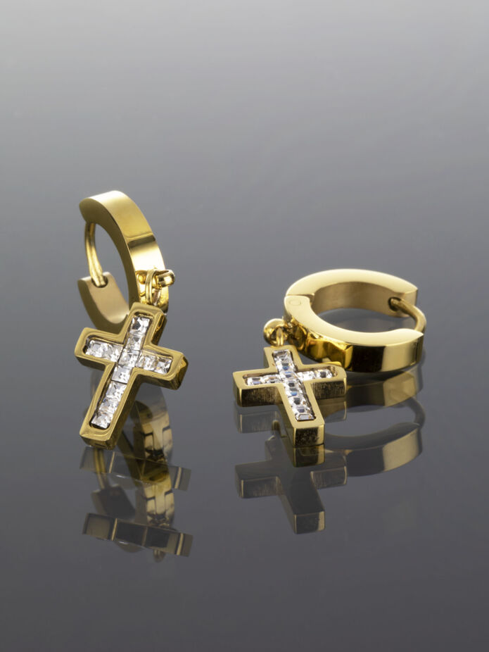 Krásné kruhové náušnice z chirurgické oceli zlaté barvy s přívěsky ve tvaru křížků a čirými krystaly jsou skvělým doplňkem k jakémukoliv outfitu. Šířka náušnic je 0,3 cm, průměr je 1,3 cm. Na náušnicích jsou zavěšeny přívěsky ve tvaru křížků o rozměrech 0,9 x 1,3 cm, křížky jsou vykládány čirými krystaly. Celková délka náušnic je 3 cm. Zapínání je na francouzský patent, tento typ zapínání skvěle drží a tak náušnice samovolně nevypadnou.