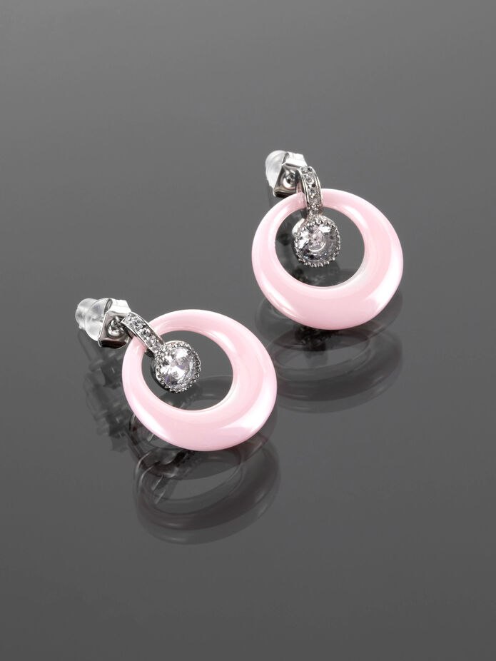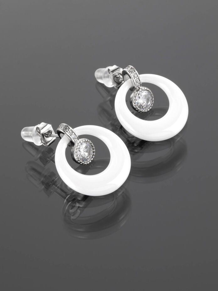 Krásné náušnice s kroužky z barvené keramiky a výrazným čirým krystalem z chirurgické oceli jsou skvělým doplňkem k jakémukoliv outfitu. Rozměry náušnic jsou 1,7 x 1,9 cm. Zapínání je na dámský patent, tento typ zapínání skvěle drží a tak náušnice samovolně nevypadnou. Náušnice stříbrné barvy z chirurgické oceli jsou zdobeny barevnými kroužky z keramiky a výrazným čirým krystalem, zpracování působí opravdu vkusně a nadčasově.