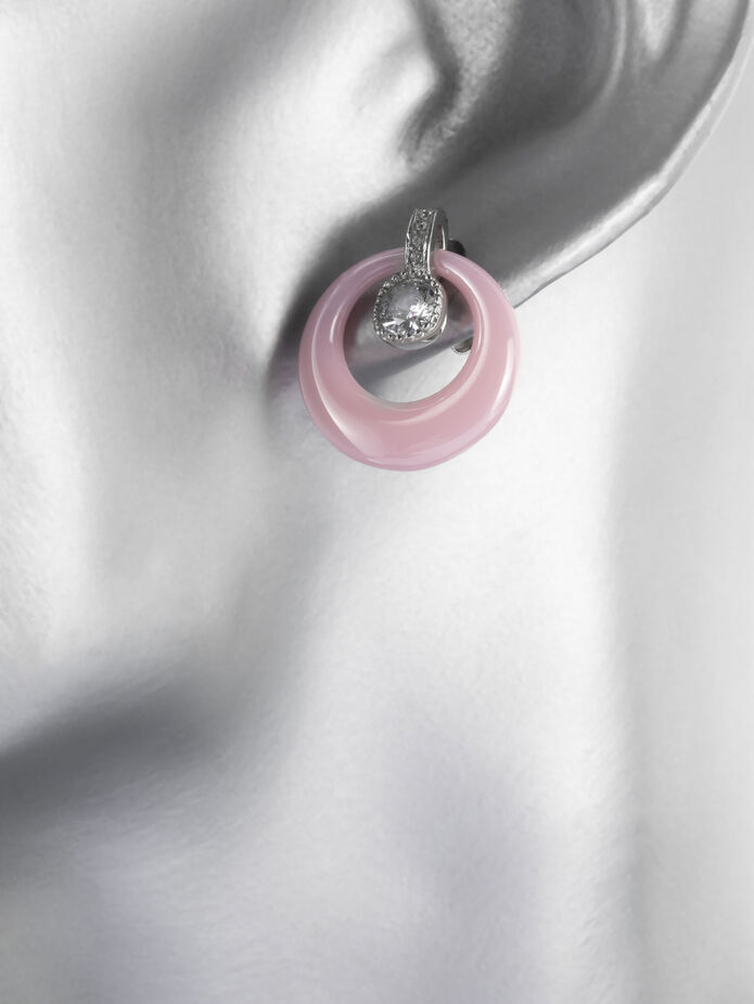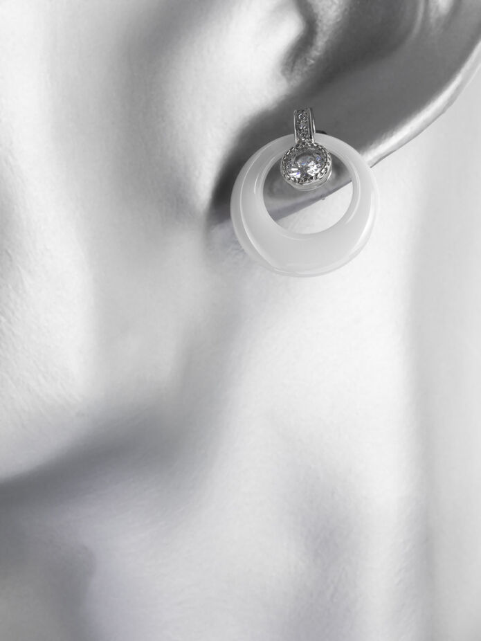 Krásné náušnice s kroužky z barvené keramiky a výrazným čirým krystalem z chirurgické oceli jsou skvělým doplňkem k jakémukoliv outfitu.