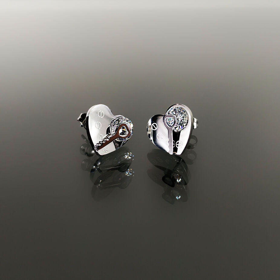 Náušnice z chirurgické oceli ve tvaru srdce s čirým krystalem a klíčkem. Zapínání je na puzetku. Náušnice jsou kvalitně zpracované, nemění barvu a jsou vhodné i pro alergiky.