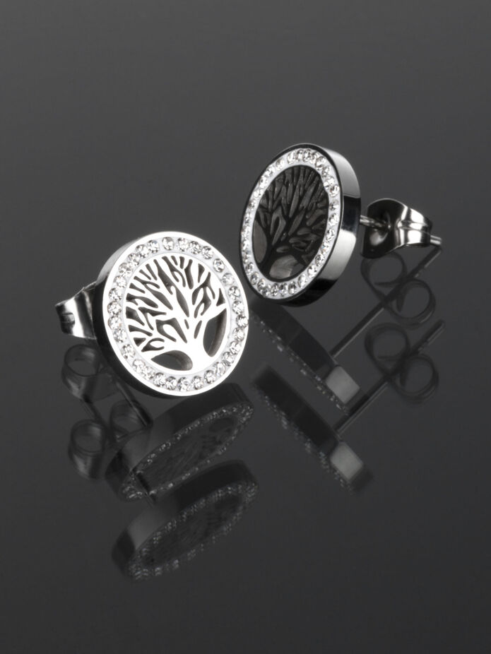 Krásné náušnice z chirurgické oceli ve tvaru kruhu s motivem stromu života vykládané čirými krystaly. Vhodné pro alergiky.