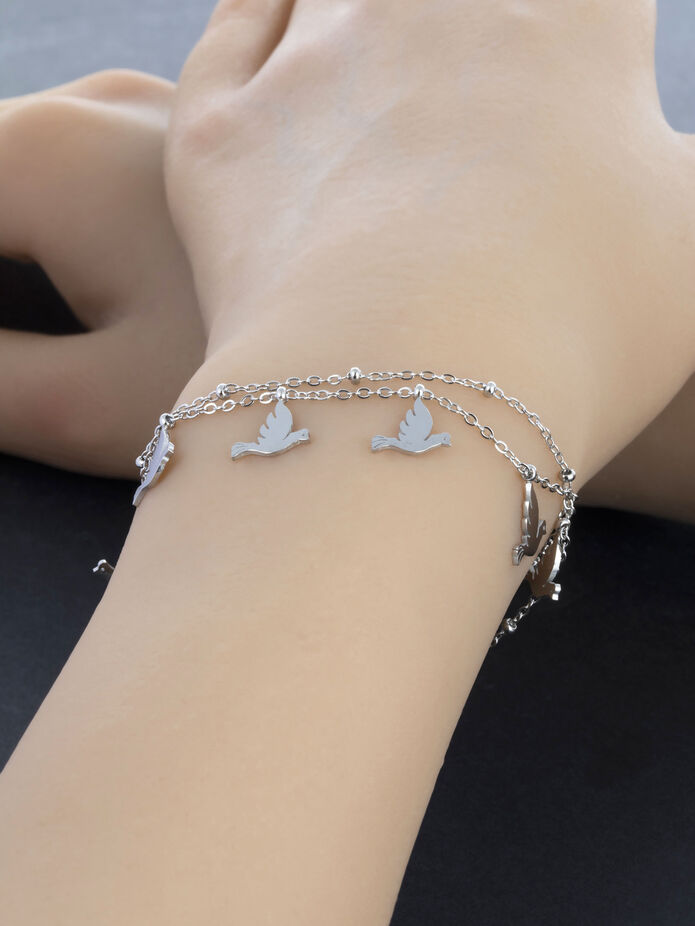 Krásný dvojitý náramek z chirurgické oceli s drobnými holubičkami a kuličkami je skvělým doplňkem k jakémukoliv outfitu.