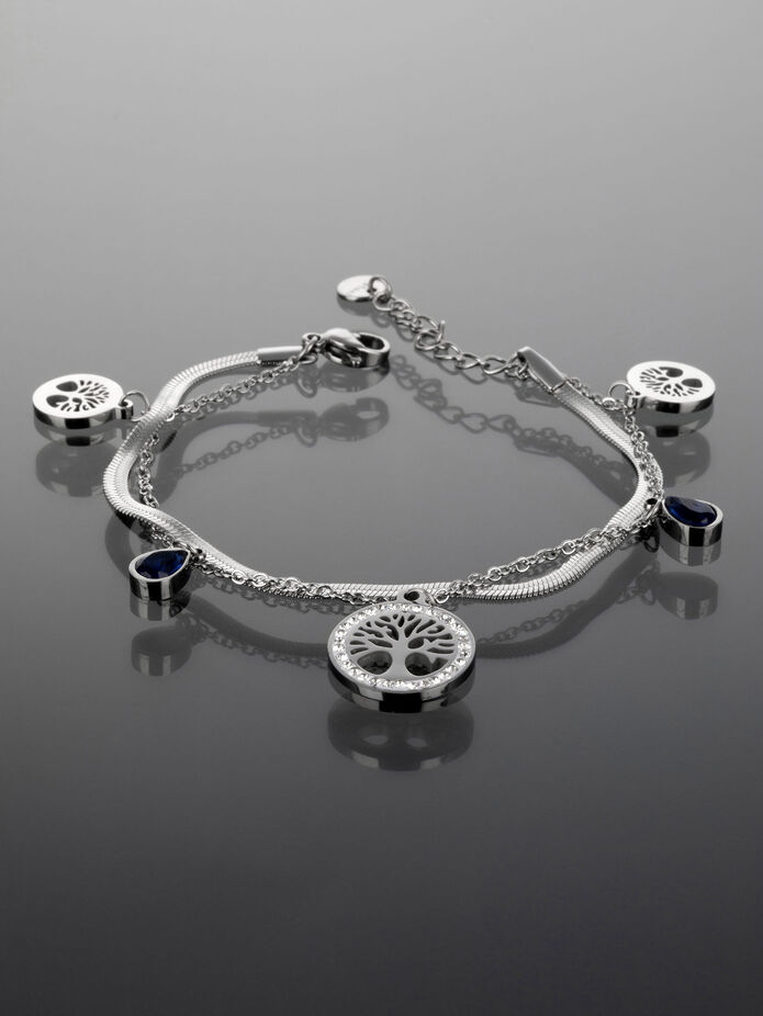 Krásný dvojitý náramek z chirurgické oceli s přívěsky stromu života a krystaly je skvělým doplňkem k jakémukoliv outfitu.