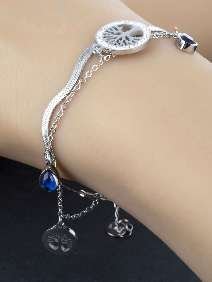 Krásný dvojitý náramek z chirurgické oceli s přívěsky stromu života a krystaly je skvělým doplňkem k jakémukoliv outfitu. Délka náramku je nastavitelná od 16 do 19 cm, průměr přívěsků je 1,5 cm. Zapínání je na karabinku, tento typ zapínání skvěle drží a tak náramek samovolně nespadne. Náramek je tvořen dvěma řetízky stříbrné barvy, na drobnějším jsou po celé délce přívěsky stromu života a kapky s modrým krystalem, zpracování působí opravdu vkusně a nadčasově.