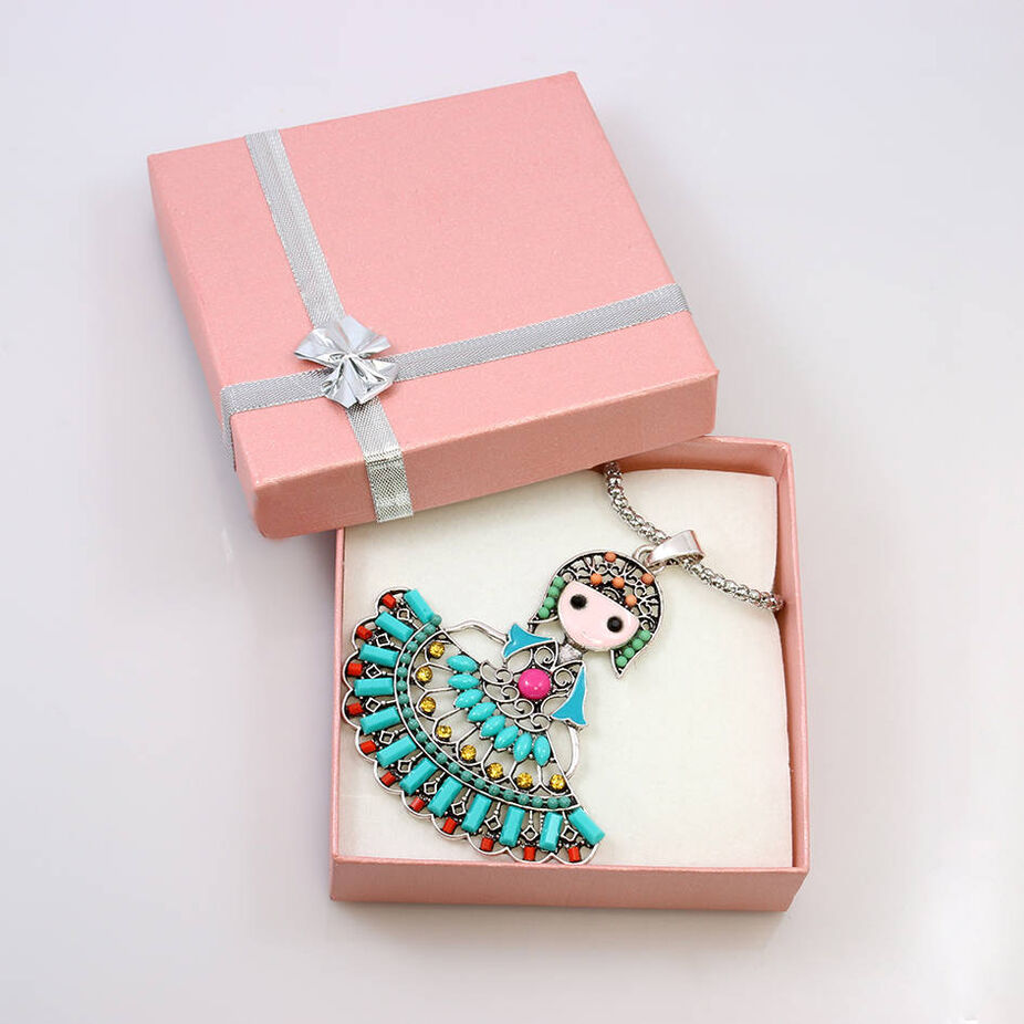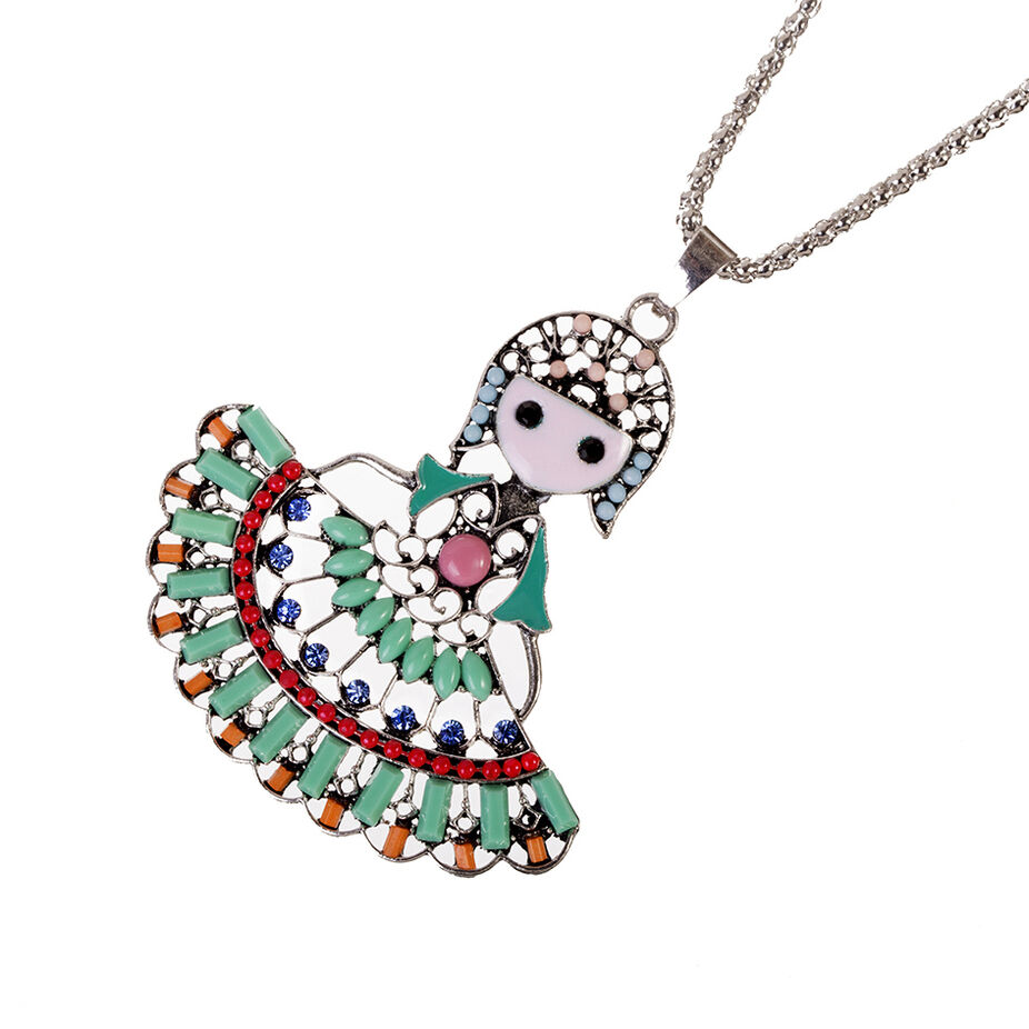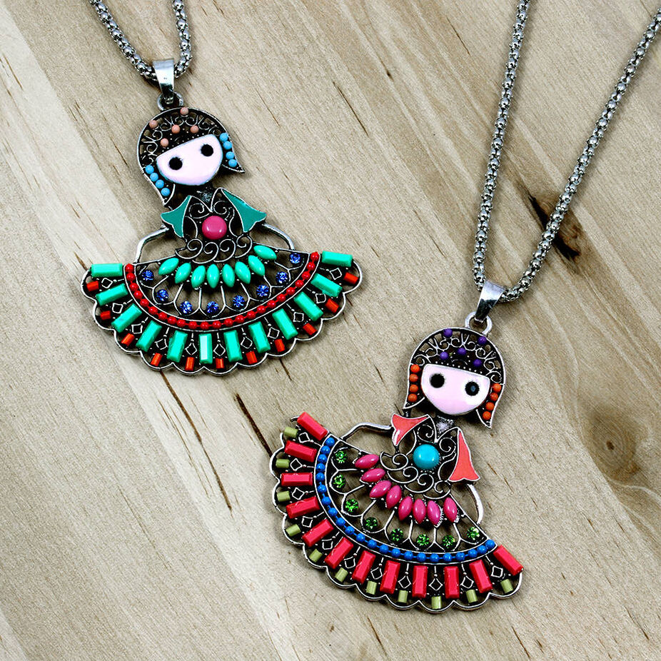 Krásný etno náhrdelník ve tvaru panenky s barevnými krystaly je moderním doplňkem ke každému outfitu. K dostání je ve více barevných provedení - růžová, modrá, zelená a černá.
